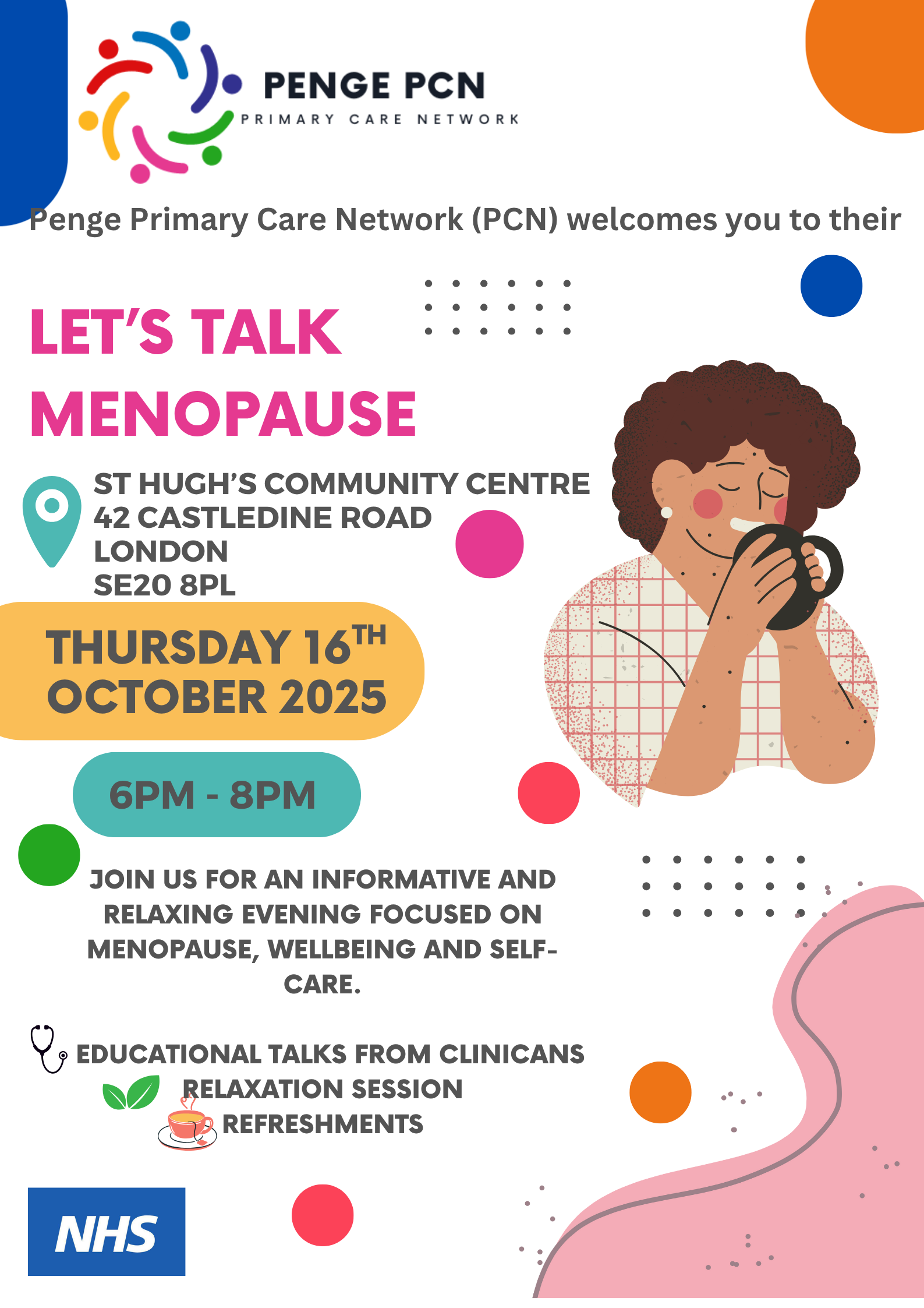 We are delighted to announce our upcoming event, “Let’s Talk Menopause”, hosted by Penge Primary Care Network (PCN).